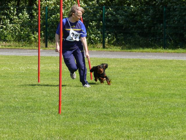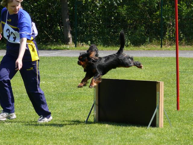 Geschichte von Kathrin Pawlazcyk Kathrin Pawlaczyk berichtet über ihren Michel vom Butzemannhaus: Ein Schoßhund, nur gemütlich auf der Couch oder ständig auf dem Arm? Oh, nein!!! Ein Cavalier, mag er noch so niedlich und klein sein, anhänglich und zärtlich, ist ein richtiger Hund. Ein Hund mit unbändigem Temperament, der gern dabei sein und vor allem mittun will! Mit meinem Cavalier, Don Juan vom Butzemannhaus, genannt Michel habe ich einen Traumhund gefunden oder er mich. Er warf sich buchstäblich erst vor unser Auto (nichts passiert!) und dann in meine Arme. Eigentlich wollte ich doch noch keinen zweiten Hund und eigentlich doch einen Boston Terrier. Nun ja, 1 Woche später zog er stolz „wie ein Spaniel“ bei uns ein und macht uns seitdem jeden Tag ein wenig glücklicher. Roswitha Fichtner, die Züchterin verdient in meinen Augen eine Goldmedaille. Züchtet sie doch nicht nur wunderhübsche (Ausstellungs-) Cavaliere, sondern Hunde mit bezaubernden Wesen, die noch dazu „pumperlgesund“ sind. Den Tierarzt kennen wir nur vom Impfen. Michel hat genau wie seine Sportmutti Whoopie die Begleithundeprüfung abgelegt. Überhaupt macht einem Cavalier einfach alles Spaß, was seinem Menschen auch gefällt. Turnierhundesport und Unterordnung, fährten, wandern, walken und spielen, alles findet er toll. Drill ist dabei nichts für ihn, er macht ja eh alles freiwillig. Konsequent sein, ja das muss man, aber liebevoll korrigierend und nicht brüllend. Leise Kommandos sind eher am Platz, vor allem, da der Cavalier verstehen will, was man von ihm will. Aber so schnell nimmt er auch nichts krumm. Er ist einfach voller Liebe zu seinen Menschen, dabei lustig und mit viel Charme. Aber Vorsicht, um den Finger ist Mensch im Handumdrehen gewickelt und ohne, dass er es überhaupt merkt. Er ist eben ein Cavalier! Einholen ohne Überholen Die 19. Landesmeisterschaft im Turnierhundesport des SGSV Landesverbandes Berlin Brandenburg fand nachdem sich die Teilnehmer bereits auf Vereinsprüfungen darauf qualifiziert hatten auf dem Hundeplatz des HSVD Rüdersdorf e.V. statt. Im THS treffen Leichtathletik und Ausbildung zusammen und verschmelzen zu einem sehenswerten Gesamtbild. Teilnehmer dieser Veranstaltung war auch DON JUAN vom Butzemannhaus. Nachdem seine Sportmutti Whoppie vom Butzemannhaus bereits in diesem Verein die Begleithundeprüfung mit bestem Ergebnis abgelegt hatte und mehrerer Turniere gewann, zieht jetzt ihr Sohn nach und hat sie gestern überholt. Er nahm bereits eine weitaus höherer Hürde als Whoopie sie erreichen konnte und startete im CSC ( Combinations-Speed-Cup) mit seinem Team. In dieser Disziplin geht es um Tempo, Gehorsam und Sozialverträglichkeit der Hunde. Drei Hundeführer sind mit ihren Hunden am Start. Dieser Wettbewerb ist bei Sportlern und Zuschauern der Knaller, denn hier wird ein gutes Zusammenspiel zwischen Mensch und Hund ersichtlich. Don Juan kämpfte gemeinsam mit einem Dobermann und einem Mischling im Team „ Junge Wilde“ gegen 4 andere Mannschaften in dieser Disziplin. Diese Veranstaltung war ein sehr schönes Erlebnis und ich bedanke mich bei Kathrin, die DON JUAN als 10 Wochen alten fehlerfreien Welpen bei mir gekauft hatte, das es ihr gelungen ist, diesen kleinen Hund zum Start zu führen. Ich bedanke mich für die Zeit, den Aufwand und die Courage, die diese Erfolge ebneten und für die Liebe, die Katrin und ihre Familie diesem kleinen Cavalier schenkten um mit ihm ein glückliches und zufriedenes Leben zu führen. Dank auch dem Trainer Bernd für seine Arbeit und seine Liebe, die er auch den kleinen Hunden schenkt und die Kraft immer das Beste aus den Hunden herauszukitzeln. Der Bürgermeister von Rüdersdorf begrüßtet und verabschiedete die Teilnehmer des Turniers mit einem „Glück auf“, denn Rüdersdorf ist eine traditionelle Kalkabbaugemeinde. Ich sage zu Katrin und DON JUAN ganz speziell „ Glück auf“ und wünsche beiden noch ganz viele Erfolge. In diesem Jahr werden wir den kleinen Sportfreund auch auf mehreren Ausstellungen treffen. DANKE Kathrin