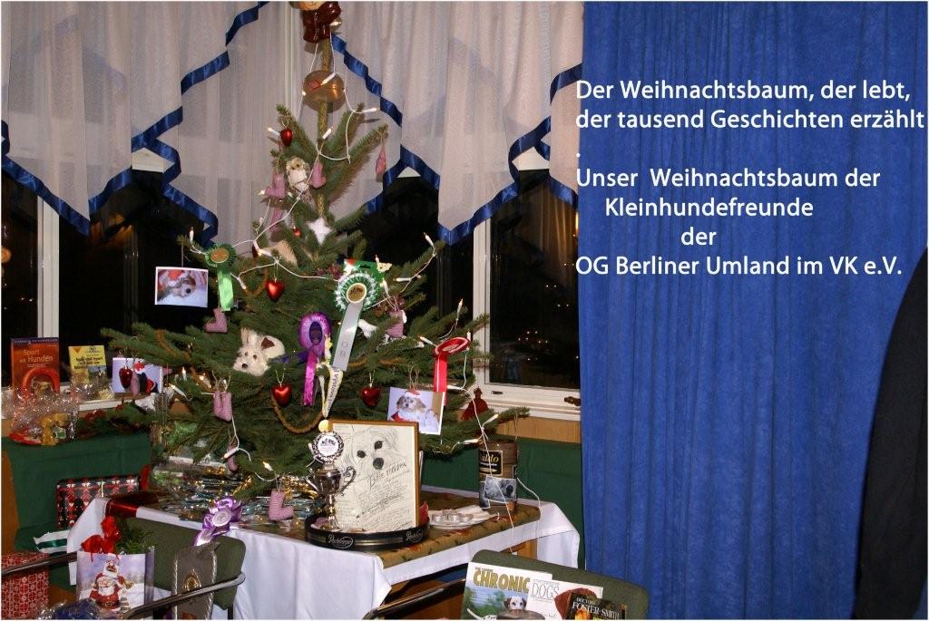 Wenn unser Weihnachtsbaum erzählt ... … dann weiß er über Geschichten unserer Ortsgruppenmitglieder zu berichten. Ein ganz solider Tannenbaum , der lediglich mit einer Lichterkette und einer VDH-Züchterplakette 2009 gekrönt war stand bescheiden auf einem Tisch. Nachdem alle Mitglieder der OG Berliner Umland eingetroffen waren, begannen wir aus dem natürlichen Tannenbaum unseren Ortsgruppenweihnachtsbaum zu schmücken. Kleine rot-weiß karierte Stiefelchen symbolisierten die Welpen, die unsere Mitglieder in diesem Jahr erfolgreich aufgezogen hatten. Glänzende rote Herzen sprachen vom Herzblut der anwesenden Züchter, die ihre alten Hunde mit Liebe pflegen, auch wenn die schönsten Jahre dieser Tiere längst der Vergangenheit angehören und von Züchtern die in diesem Jahr mit besonders widrigen Ereignissen zu kämpfen hatten und als Sieger hervorgingen. Herzblut, was geflossen ist! Ich hielt 10 Weihnachtsherzen bereit, sie haben nicht ausgereicht, um alle Hunde, die durch die anwesenden Züchter mit ungeteilter Aufmerksamkeit gepflegt werden zu bedenken. Mit kleinem Hundespielzeug wurde der Baum für die Babyhunde, die unsere Ortsgruppe mit Begeisterung und Freude verstärken wollen geschmückt. Es wurden Geschichten über Pokale erzählt, die deren Besitzer im Jahr 2009 oder auch zu früherer Zeit erworben hatten. Jeder Einzelne erzählte, seine Trophäe in der Hand über deren Geschichte mit geöffnetem Herzen. Mit Applaus, Staunen, feuchten oder auch glänzenden Augen wurde erzählt und zugehört. Im gleichen Tempo wuchs die Schönheit unseres Weihnachtsbaumes, der nun mit allerhand Schleifen und Plaketten geschmückt wurde. Die Lieblingspokale standen strahlend um und unter dem Baum herum zwischen bunten und hübsch verpackten Geschenkpäckchen mit allerhand Schnickschnack. Andere Mitglieder, beschenkten unseren Baum mit Fotographien ihrer Hunde, mit einem Foto ihres genehmigten Zwingerschutzes und sogar ein handgemaltes Bild von einem Kind, das Zeugnis von einer Suchmeldung nach einem Havaneser ablegte, fehlte nicht im Rahmen unseres Hundegeschichten-Weihnachtsbaumes. Ein vorweihnachtliches Geschenk, das keiner der Anwesenden jemals vergessen wird. Bei dem gemeinsamen Gesang „O Tannenbaum“, strahlte die Weihnachtsstube der OG Berliner Umland durch ein zufriedenes Lächeln der Mitglieder und zufriedene Herzen. Ein Geschenk, eine kostbare Gabe, die nur durch das aktive Leben aller Mitglieder und durch deren Hunde erworben werden konnte. Es gibt keinen Ersatz für das eigene Erleben.