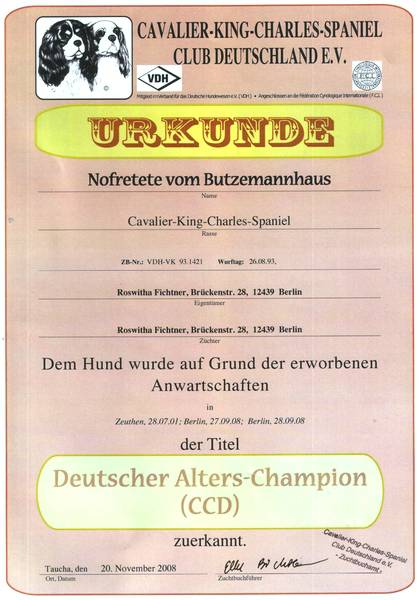 auf der KSA Spezial-Zuchtschau in Berlin in der Zwischenklasse die Bewertung V2, sowie alle Reserveanwartschaften