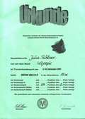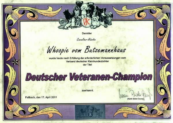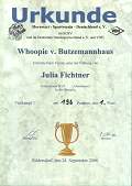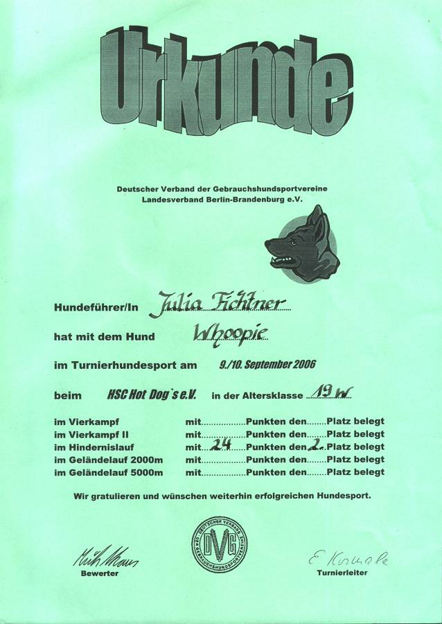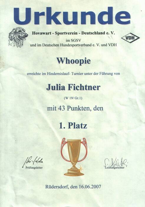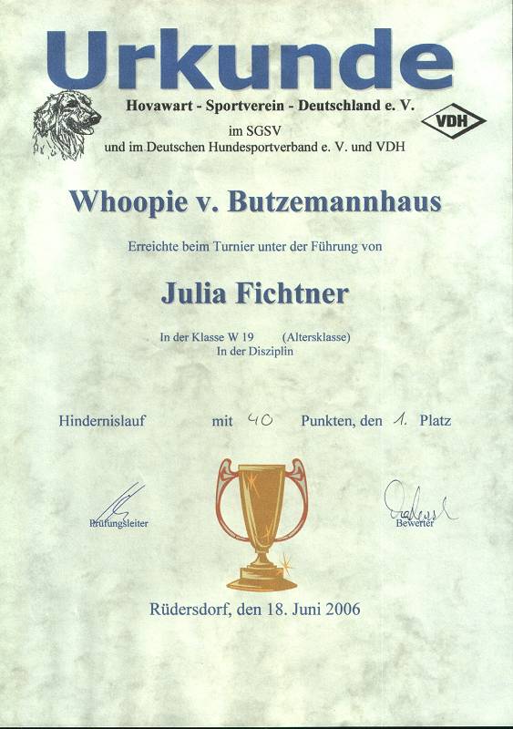 Mitteilung des HSVD e.V. Rüdersdorf Whoopie hat am 12.11.2006 die Begleithundeprüfung bestanden und war von 7 teilnehmenden Hunden die Beste in der Unterordnung. damit zeigte Hundeführerin , Julia Fichtner, dass Whoopie kein Couchhund ist und Whoopie wurde mit diesem Erfolg " HUND DES MONATS NOVEMBER"