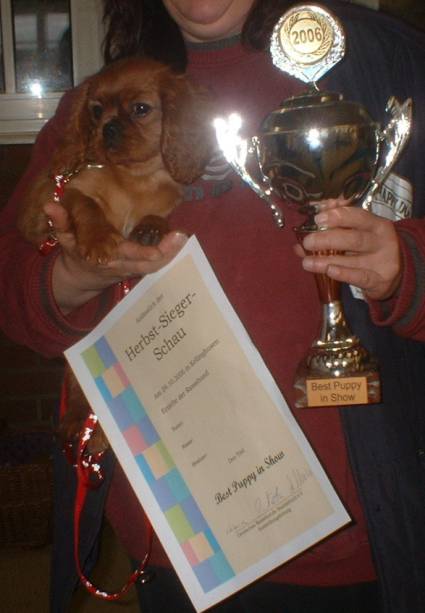 Hallo Roswitha, wie versprochen schicke ich Dir Felias Ausstellungserfolge. Herbst-Sieger-Schau sie bekam in der Babyklasse die Note vv und den Titel: Baby Herbstsieger dann holte Felia noch den Titel: Best Puppy in Show schicke Dir 2 Bilder von Felia mit. Liebe Grüße Rosi & Felia